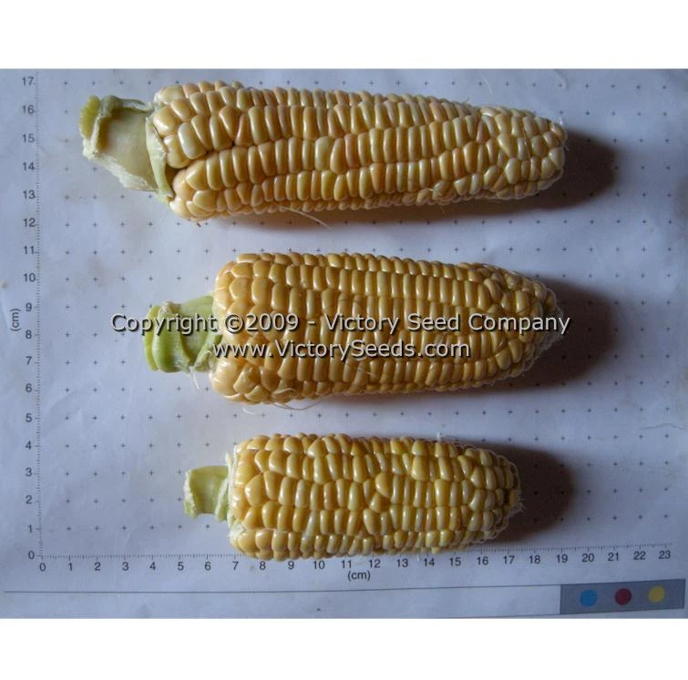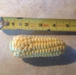 55 days — ‘Yukon Chief’ is a very good choice for home gardeners who have limited space, want to try corn in raised beds or containers, or for folks gardening in locations with cooler, shorter growing seasons. As you can see from the reviews below, it is quite popular. At 55 days, it is one of the earliest maturing sweet corn varieties we know of. The stalks are dwarf (three to four feet tall) and produce six to eight inch, yellow, sweet ears that are slightly tapered, average four to five inches in length, and have about twelve rows of kernels. As illustrated in the photo above, some ears will reach six inches.