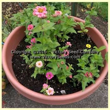 The plants are attractive, stay very compact but can reach eighteen to twenty four inches in height and blooms from mid-summer into late fall. This zinnia mix has flowers that bloom in hues of pink, red, orange, yellow, and white and are attractive to bees, butterflies and birds. Also is great as a cut flower.